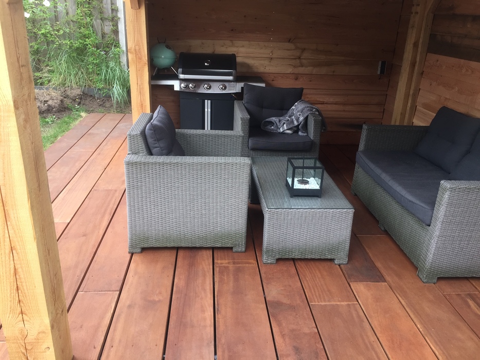 "Veranda in opbouw: Nu al een prachtig resultaat!" ⭐⭐⭐⭐★ 4,5/5. "De vlonder en de complete overkapping werd snel geleverd al met 7 weken. Alle onderdelen van de overkapping waren genummerd en er werd een handleiding en bouwtekening bijgeleverd. Met een paar man hebben wij alle balken in een middag in elkaar gezet. De epdm dakbedekking zat er eind van de middag al op. Op dag 2 hebben we de boeidelen gemonteerd en de hardhouten vlonder aangelegd. De tweede avond hebben we de overkapping al gelijk gebruikt voor een gezellige barbecue met vrienden. Ik zou Hardhout Discount zeker aanraden. Wij hadden wel al wel wat klus ervaring."