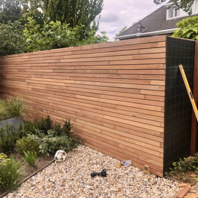 Door het gebruik van de 7,0 cm brede lamel creëert u meer diepte in uw tuinwand. In combinatie met de zwarte clips ontstaat een prachtig schaduweffect dat de natuurlijke kleur van het Ipé hout versterkt.