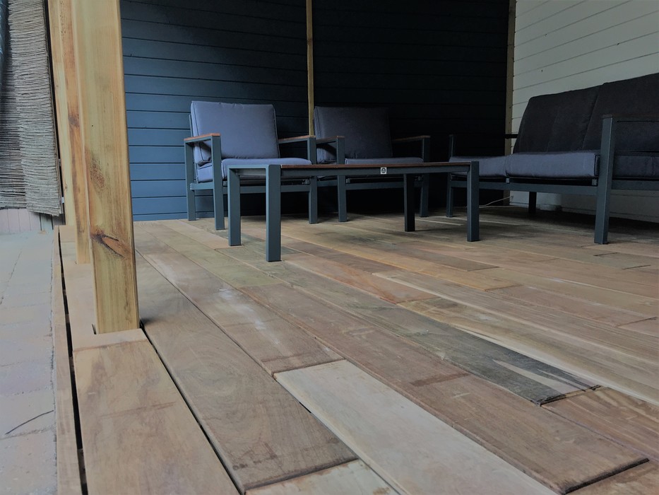 "pe Vlonderplanken" ⭐⭐⭐⭐⭐5/5. "Ipe vlonder onzichtbaar geschroefd in overkapping. Nadat we in het voorjaar onze bestaande overkapping hadden opgeknapt wilden we het betegelde terras vervangen door een verhoogde houten vlonder. Nadat we een aantal proefmonsters hadden vergeleken hebben wij gekozen voor Ipe vlonderplanken met onzichtbare bevestiging. Het monteren met clips was eenvoudig, ik vond het persoonlijk nog makkelijker dan het leggen van een kliklaminaat vloer. Een bijkomend voordeel van de clips is dat je geen rekening hoeft te houden met de afstand tussen de planken omdat de bevestigingsclip hier automatisch voor zorgt. We zijn erg blij met het resultaat. De klantenservice van Hardhout Discount heeft daarnaast al onze vragen telefonisch perfect beantwoord en de vlonderplanken zijn zoals afgesproken netjes de dag na het plaatsen van de bestelling geleverd.