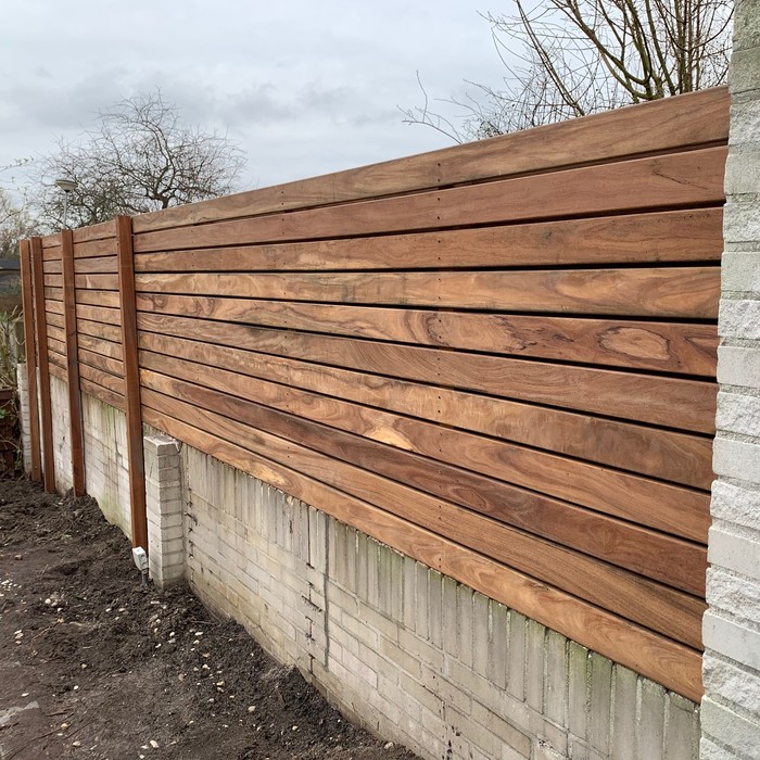 "Latten schutting horizontaal op stenen muur" ⭐⭐⭐⭐★ 4,8/5. "Hierbij 2 foto’s van ons muurtje die wij hoger hebben gemaakt met een lamellen schutitng. We hebben dit met z’n tweeën neergezet neergezet., was 1,5 dag werk. Op het muurtje van 80 cm hoog hebben wij een lange lat gemonteerd met slagpluggen, daarop staanders op u-vormige gegalvaniseerde houders. Tegen deze staanders hebben we aan de tuinkant én aan de kant van het gemeentelijk pad versprongen de bij jullie aangeschafte hardhouten planken geschroefd. Ter afsluiting hebben we aan de binnenkant staanders gezet op dezelfde u-vormige stalen houders, die vastgezet zijn in de fundering van het muurtje en nog aan het muurtje zelf geschroefd. Deze staanders zijn door en door tegen de schutting en palen gemonteerd. Gemakkelijke montage met de montage clips voor onzichtbaar schroeven en was ook de afstand houder, dus recht gaan en mooie lijnen maken was heel gemakkelijk. Het geheel staat als een huis nu, alle A-B-C-D-E etc.-stormen zijn welkom.