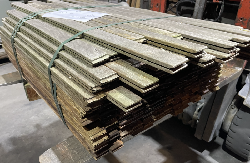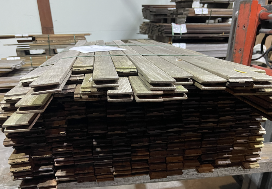 Als je geld wil besparen dan koop je deze lamellen, nog steeds van het mooie IPE hout, maar dan wel met een foutje. Zaag het foutje uit je plank door deze af te korten. Of schuur de planken op, om ze weer mooi te krijgen.